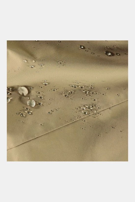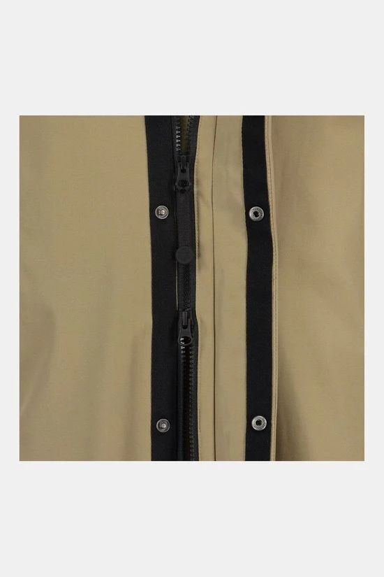 - De stof van dit regenjack is uitgeruist met het Poray 5.000 membraan. Dit houdt regen buiten dankzij microscopisch kleine poriën, terwijl transpiratie wel kan optsnappen. Hoe hoger het Poray nummer, hoe hoger de bescherming.